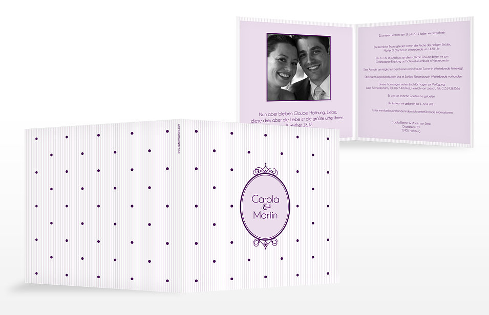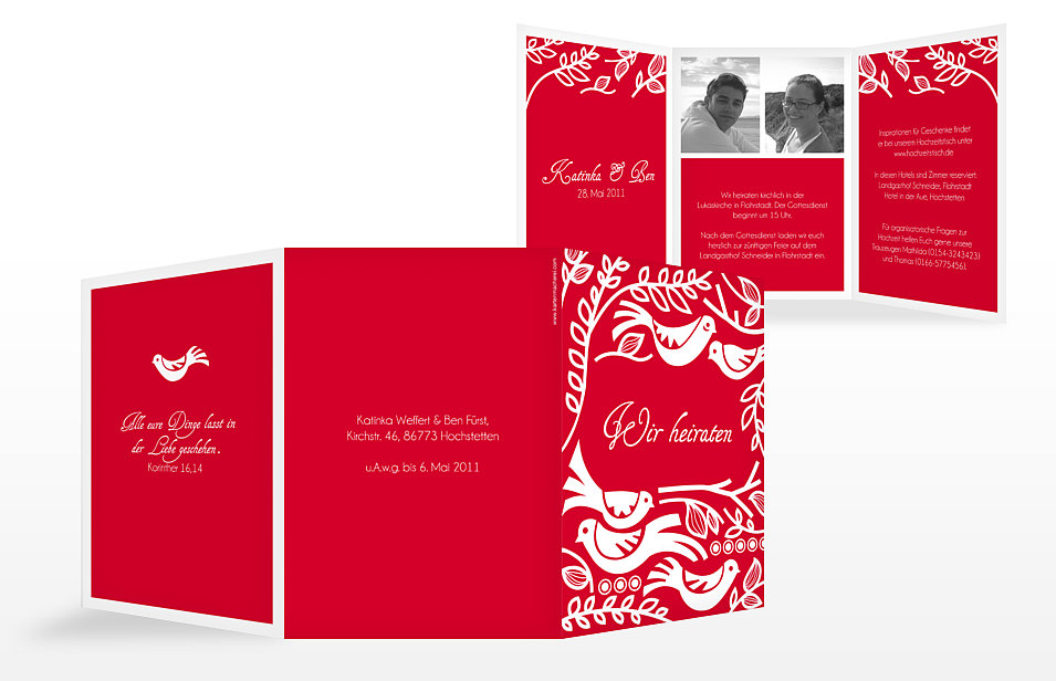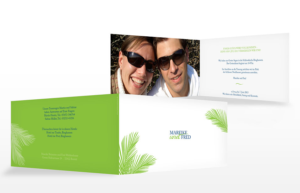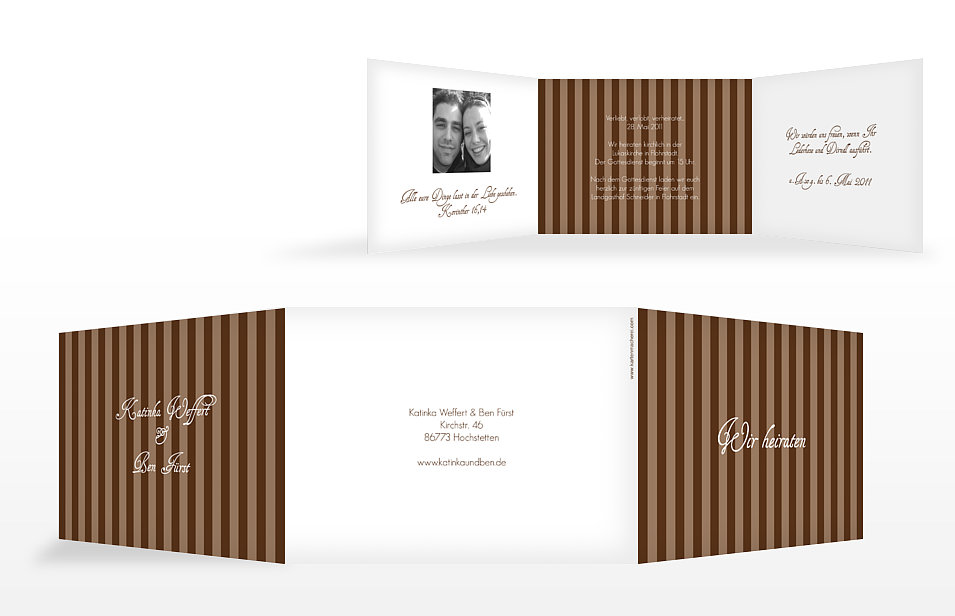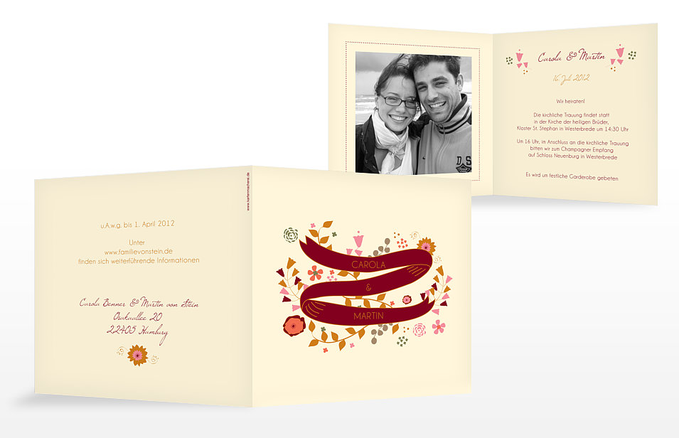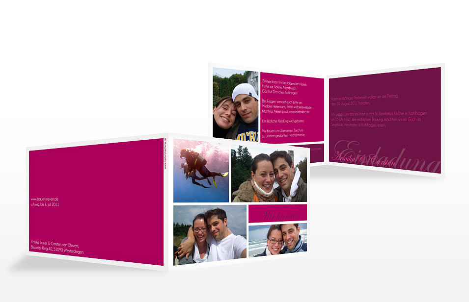 Außerdem können Sie dem Hochzeitspaar bei der Vorbereitung unter die Arme greifen, indem Sie z.B. die Hochzeitseinladungen besorgen. Keine Angst, auch für individuelle Einladungen müssen Sie nicht selbst zu Schere und Kleber greifen! Im Zeitalter des WWW können Sie die Karten einfach am PC selbst gestalten und dann professionell drucken lassen, z.B. bei der Kartenmacherei. Eigene Fotos und Sprüche sorgen dafür, dass die Einladung etwas Besonderes wird und nicht wie eine 0815-Karte aus dem Schreibwarengeschäft wirkt. Die Kartenmacherei hat uns einige Beispieleinladungen zur Verfügung gestellt.